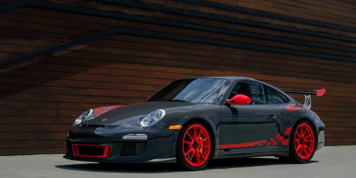 This 2011 Porsche 911 997.2 GT3 RS is one of 541 examples built for the US market during a two-year production run. Finished in Gray Black with red accents, the car is powered by a 3.8-liter flat-six linked with a six-speed manual transaxle and a limited-slip differential. Equipment includes the Chrono...
