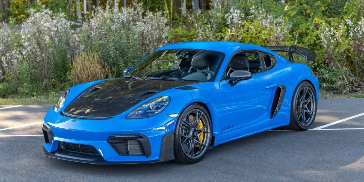 This 2025 Porsche 718 Cayman GT4 RS is finished in Shark Blue over Black leather with Deep Sea Blue Race-Tex inserts and was ordered with the Weissach and Chrono packages as well as a front-axle lift system, PCCBs, carbon-fiber bucket seats, 20″ forged wheels, and LED headlights with PDLS. The...