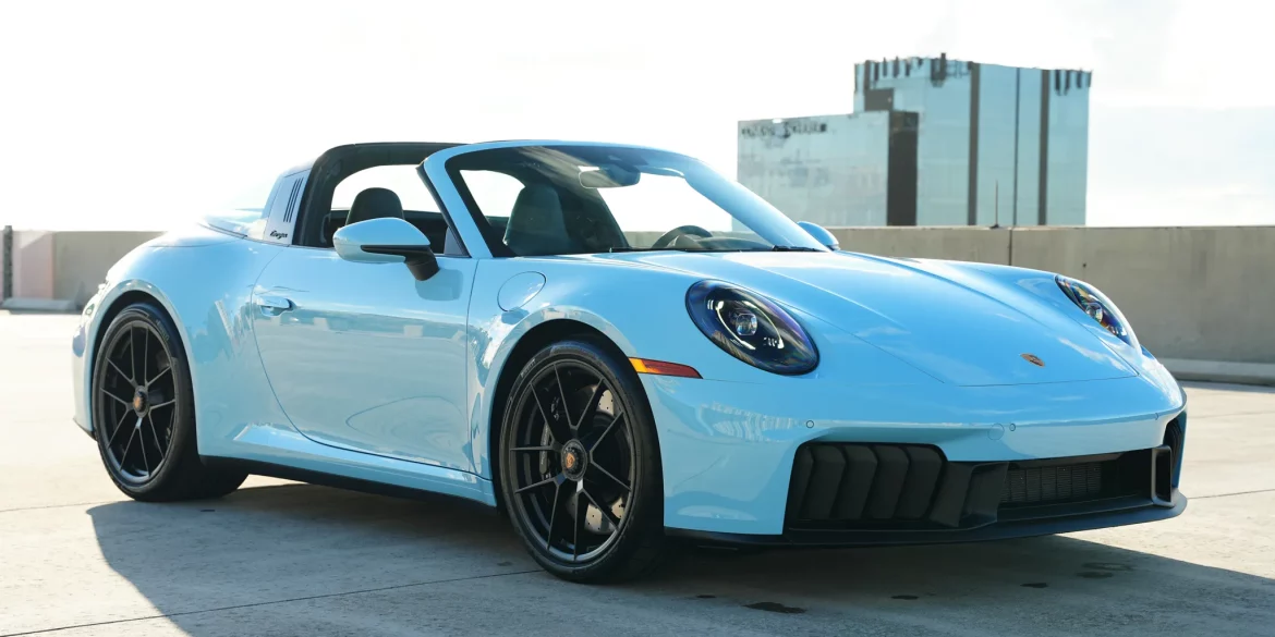 This 2026 Porsche 911 Targa 4 GTS was specified from the factory finished in paint-to-sample Gulf Blue with a black roof over a Heritage Design Interior in Basalt Black with Club leather and Pasha cloth upholstery. The car is powered by a turbocharged 3.6-liter flat-six with a T-hybrid system mated...